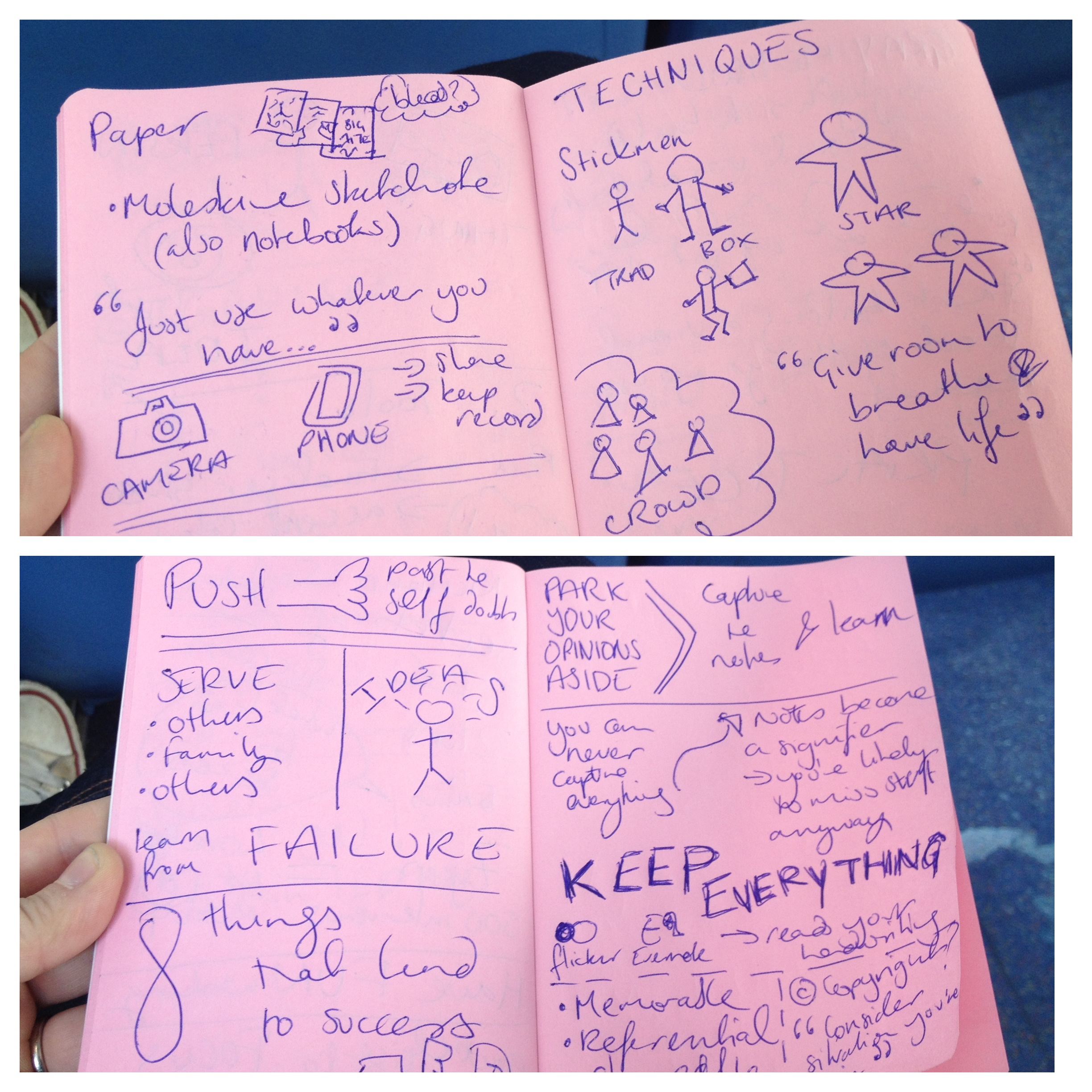 I’ve seen a bunch of other sketchnotes since, but not been tempted to begin using the technique myself as I cannot draw (At all. Really, I’m terrible at it). But when I spotted there was a workshop on it at UXCamp, I was keen to go along and find out more about it.