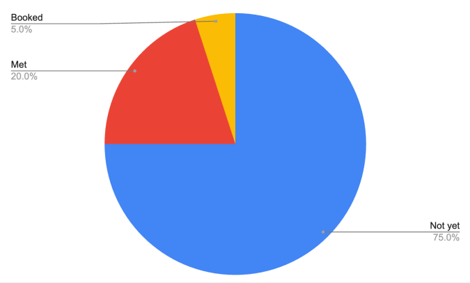 19 met, 5 booked. Just shy of 25%. But with a travel-heavy Q2 looming, I’ll be racking up catch-ups at pace.
