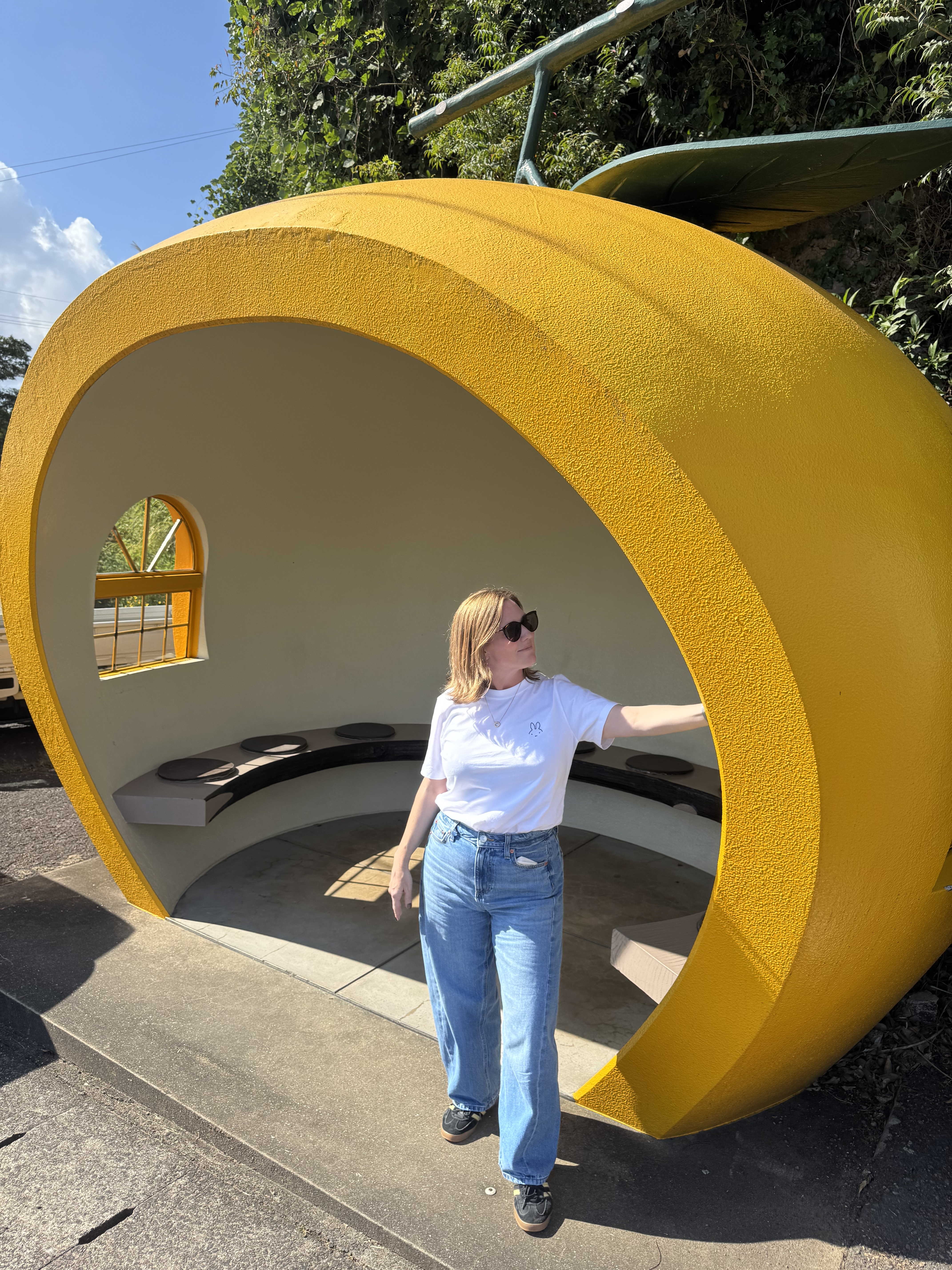 The rest of the week blurred between rooftops and basketball games, onsen and Halloween costumes. Proof that even in decline, a city can still have fun. One afternoon I took a trip up the coast to see a series of fruit-shaped bus stops (mandarins, strawberries, melons) built in the 1990s for no reason other than civic whimsy. A perfect, pointless joy.